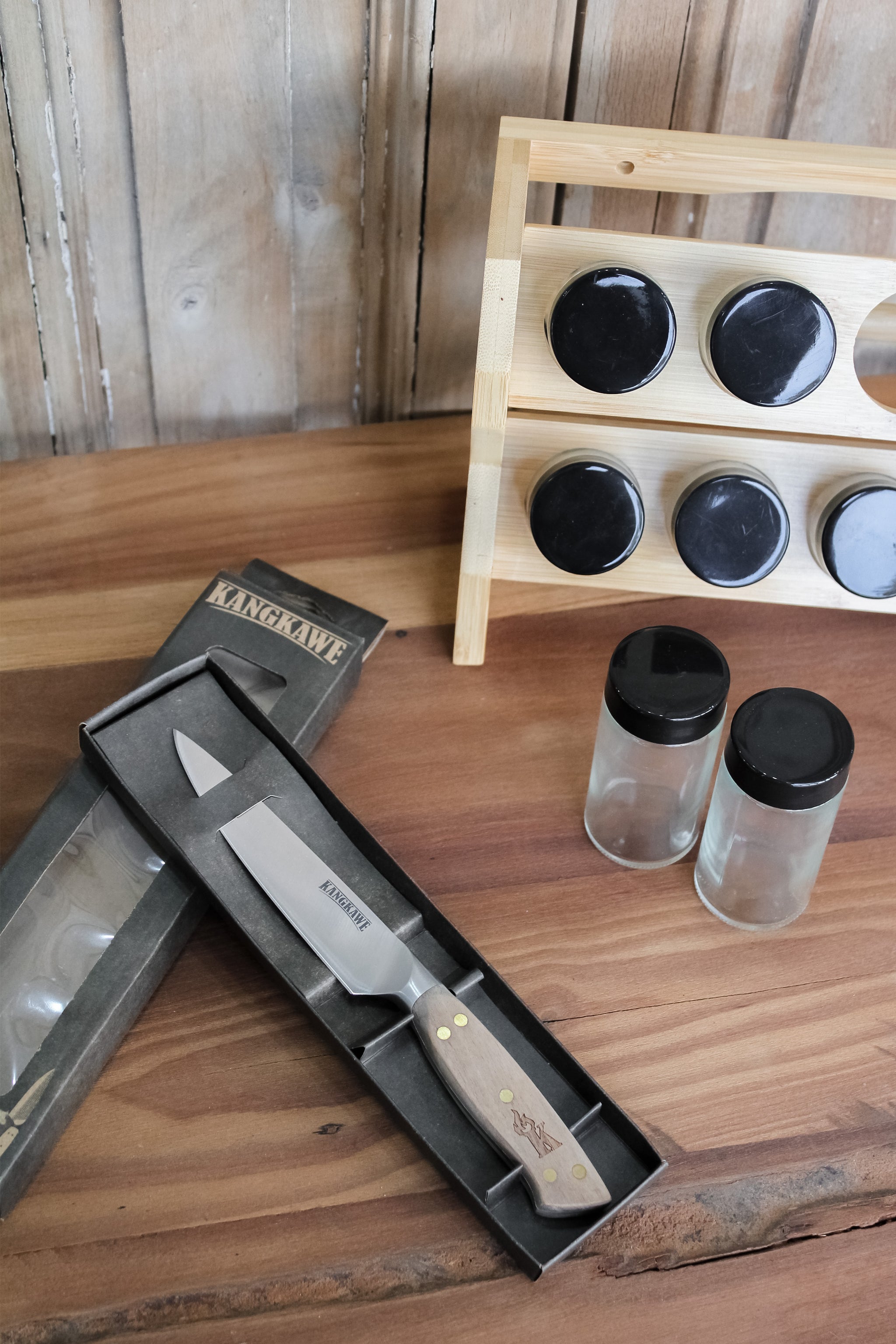 Contiene ocho especieros en su estructura de madera y un cuchillo marca Kangkawe, de un peso y porte exquisito.
