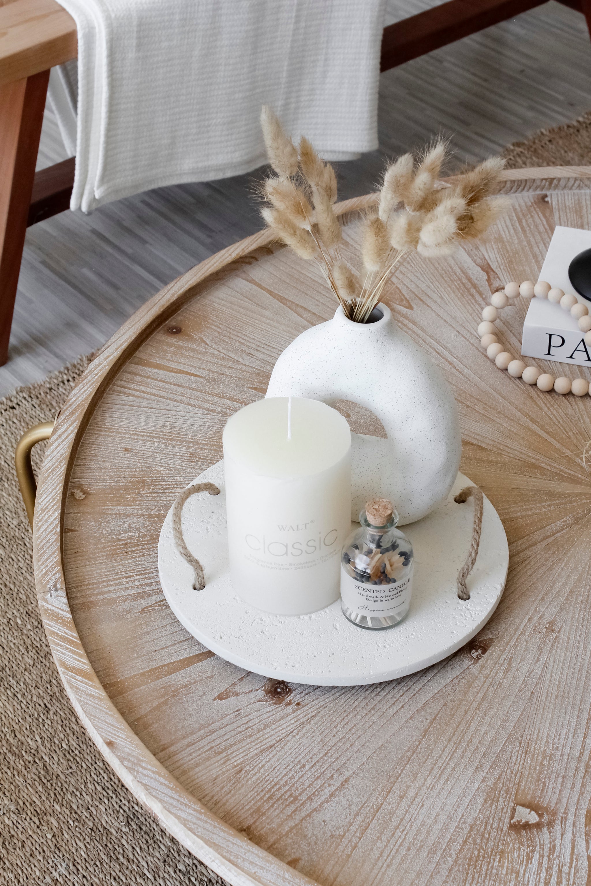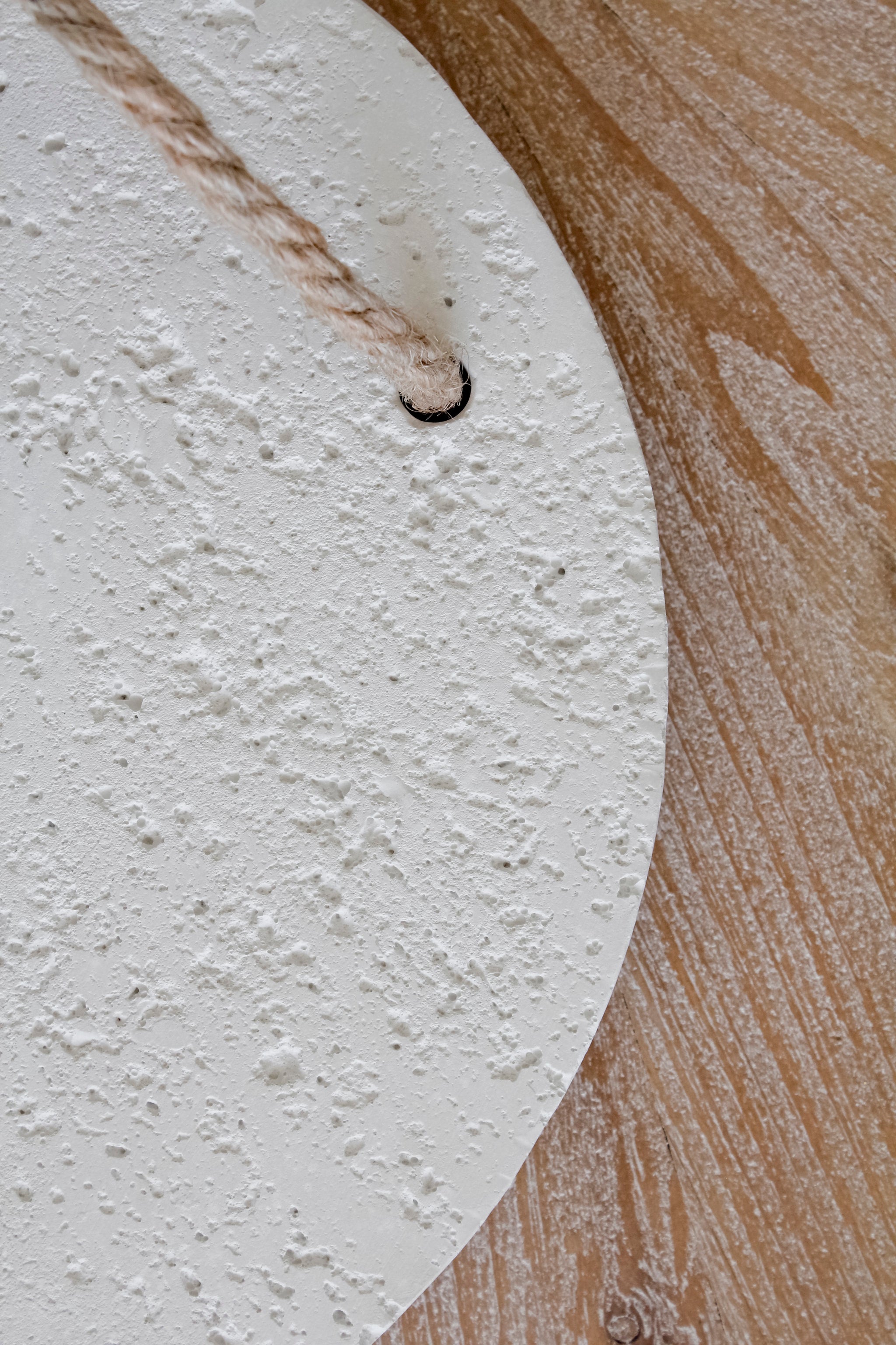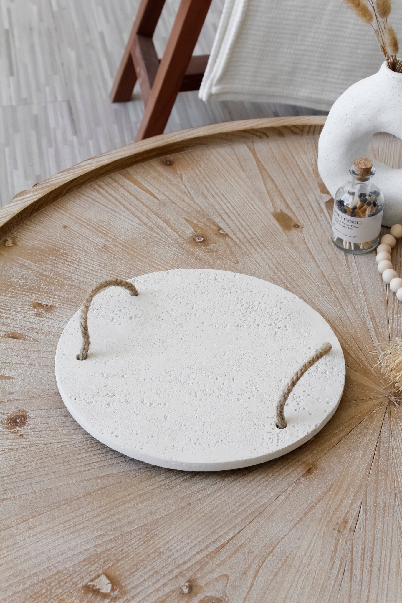 Esta preciosa bandeja redonda en color blanco y mangos de cuerda es el modelo perfecto de toque minimalista y moderno, que aportará luz al espacio donde la montes. Su textura que imita la piedra porosa y sus mangos de cuerda, entregan un aire fresco y natural, que se integra de manera delicada en cualquier estilo de decoración.