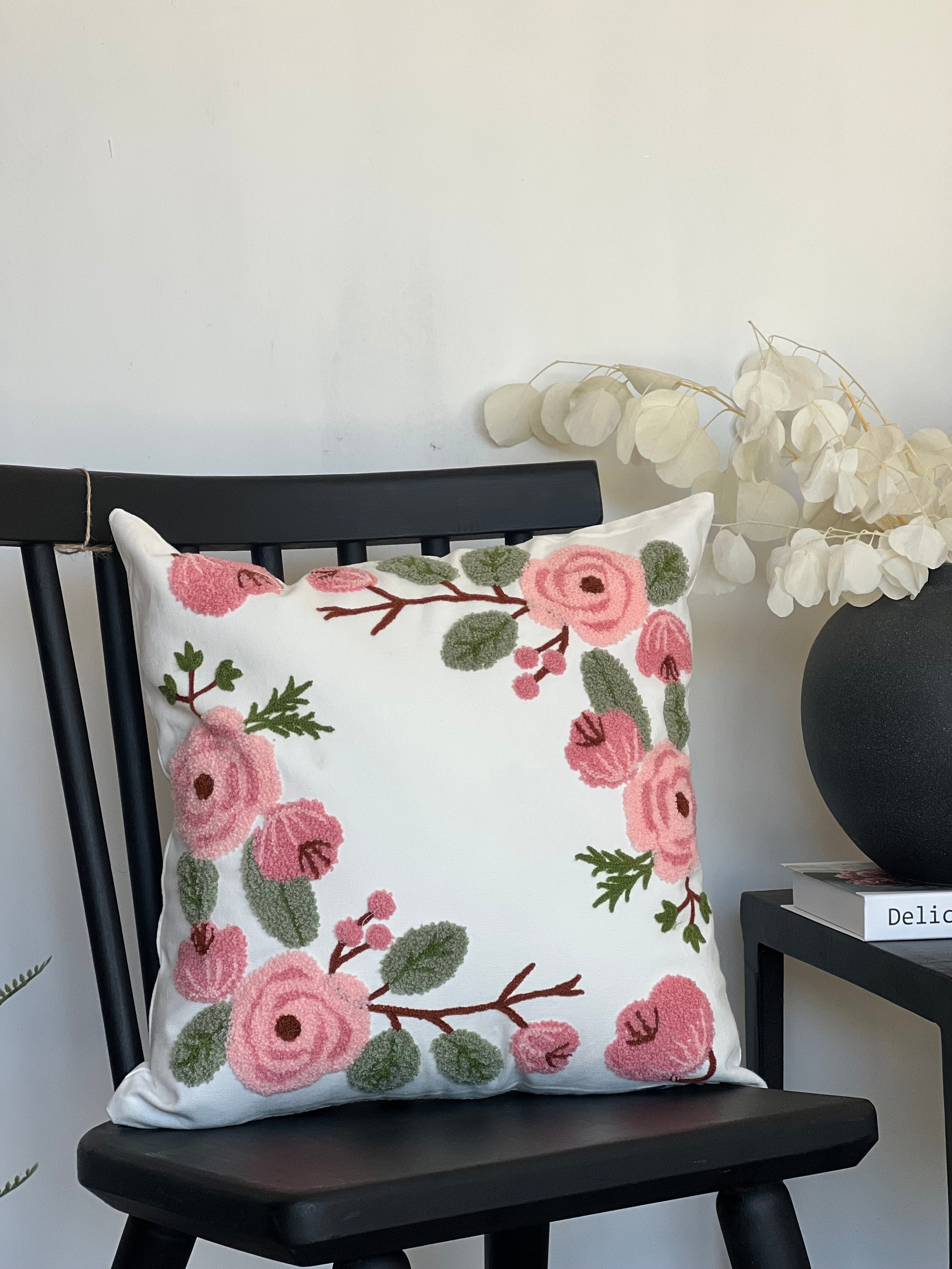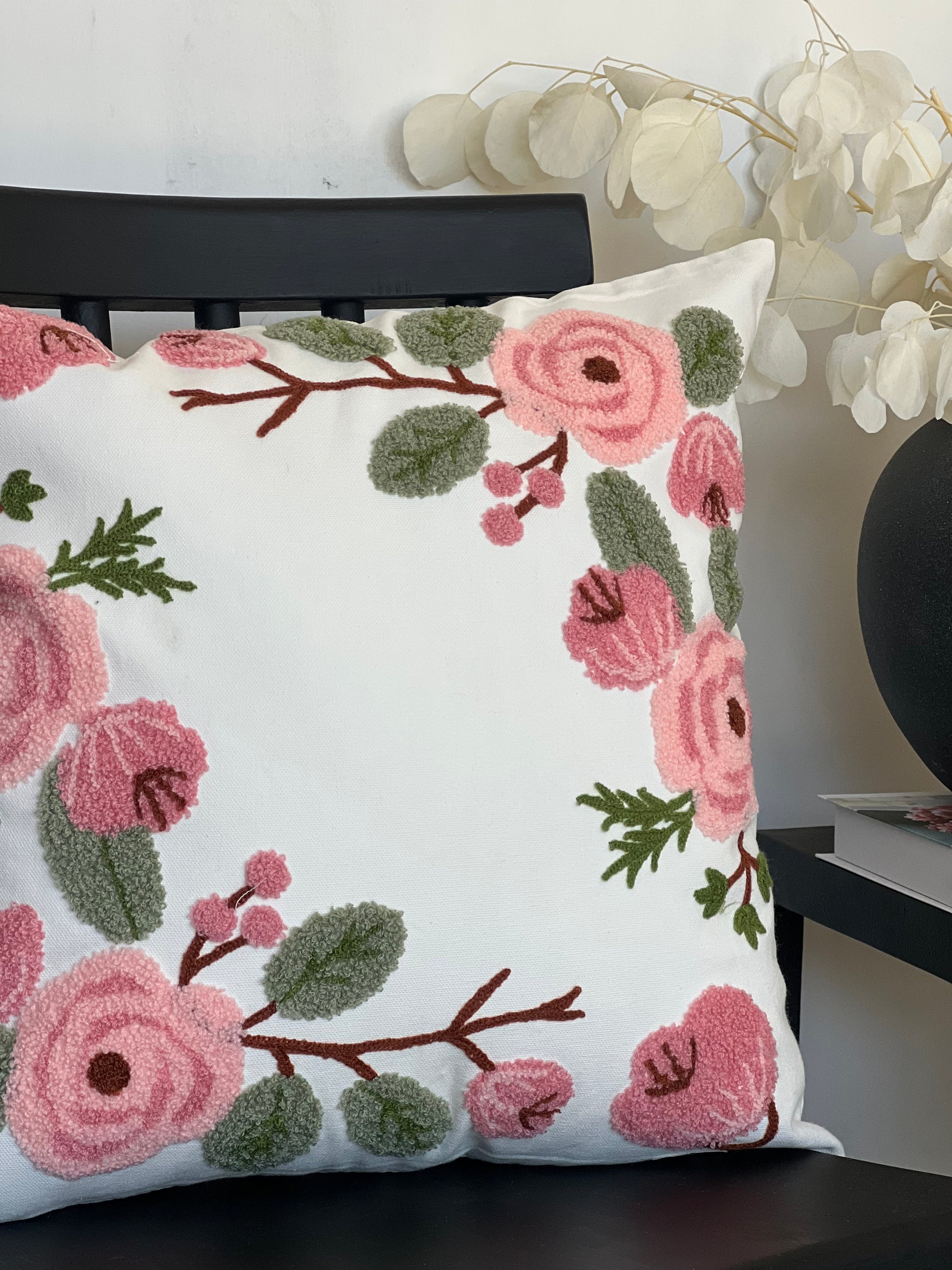 Funda de cojín de fondo blanco y diseño de flores bordadas en tonalidades rosadas, verdes y café. Una imagen increíble a la vista.
