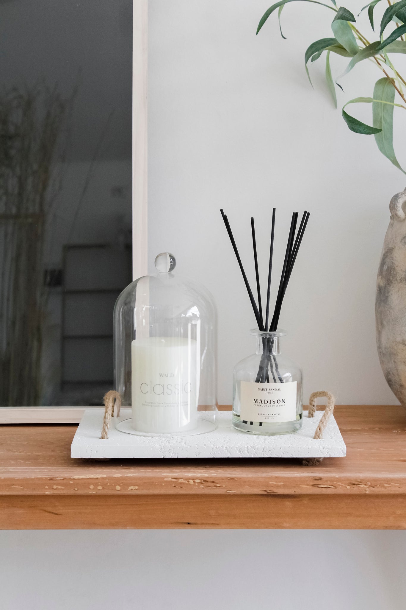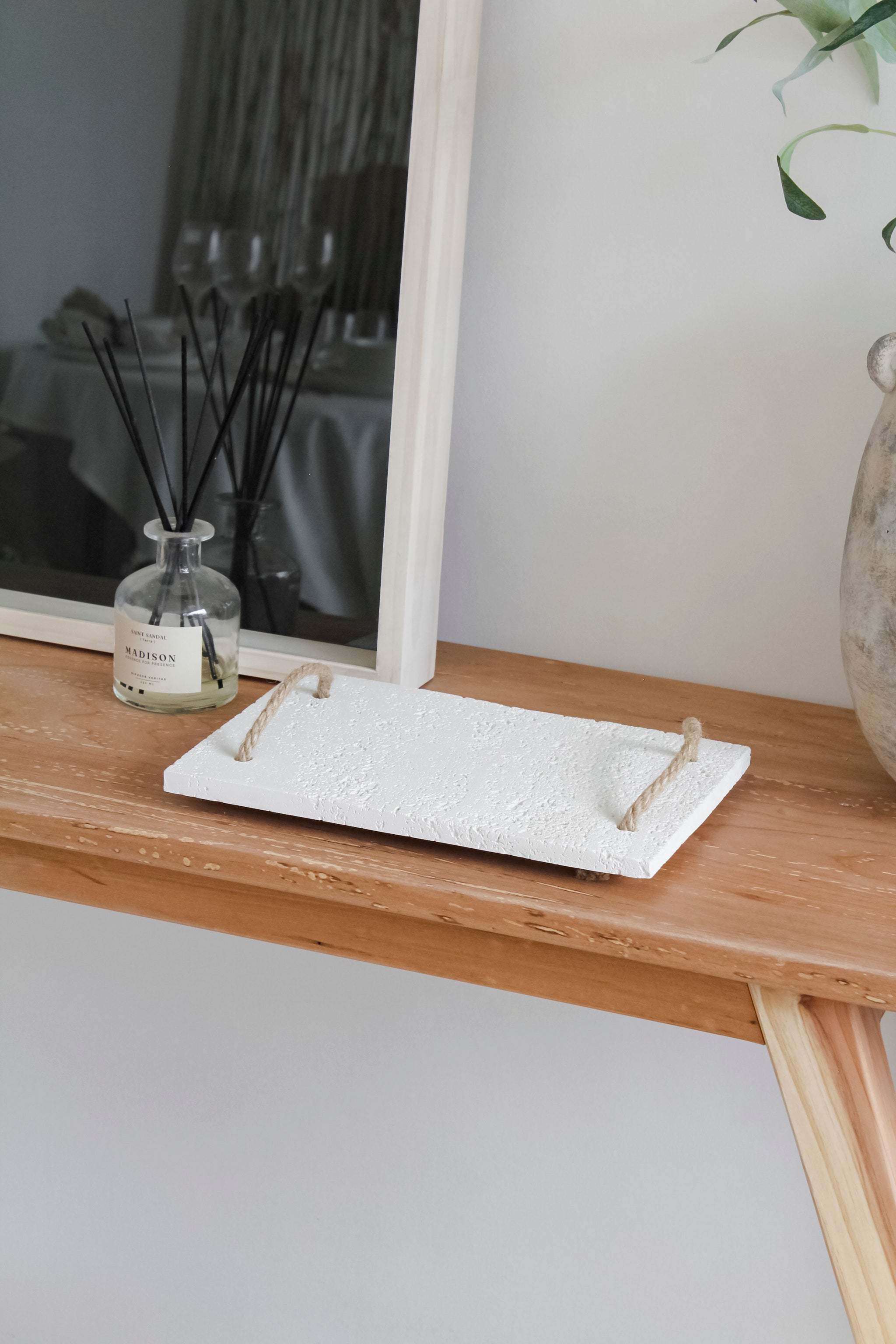 Esta preciosa bandeja rectangular en color blanco y mangos de cuerda es el modelo perfecto de toque minimalista y moderno, que aportará luz al espacio donde la montes. Su textura que imita la piedra porosa y sus mangos de cuerda, entregan un aire fresco y natural, que se integra de manera delicada en cualquier estilo de decoración.