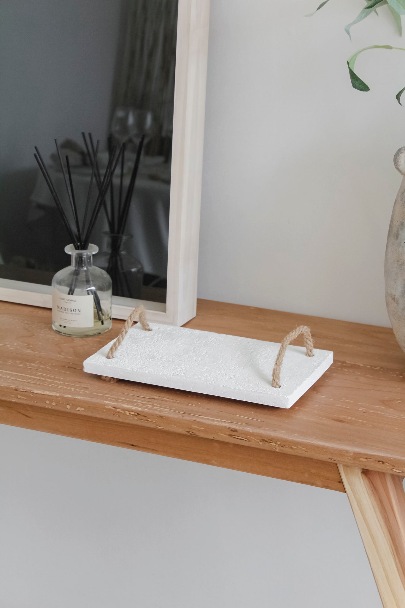 Esta preciosa bandeja rectangular en color blanco y mangos de cuerda es el modelo perfecto de toque minimalista y moderno, que aportará luz al espacio donde la montes. Su textura que imita la piedra porosa y sus mangos de cuerda, entregan un aire fresco y natural, que se integra de manera delicada en cualquier estilo de decoración.