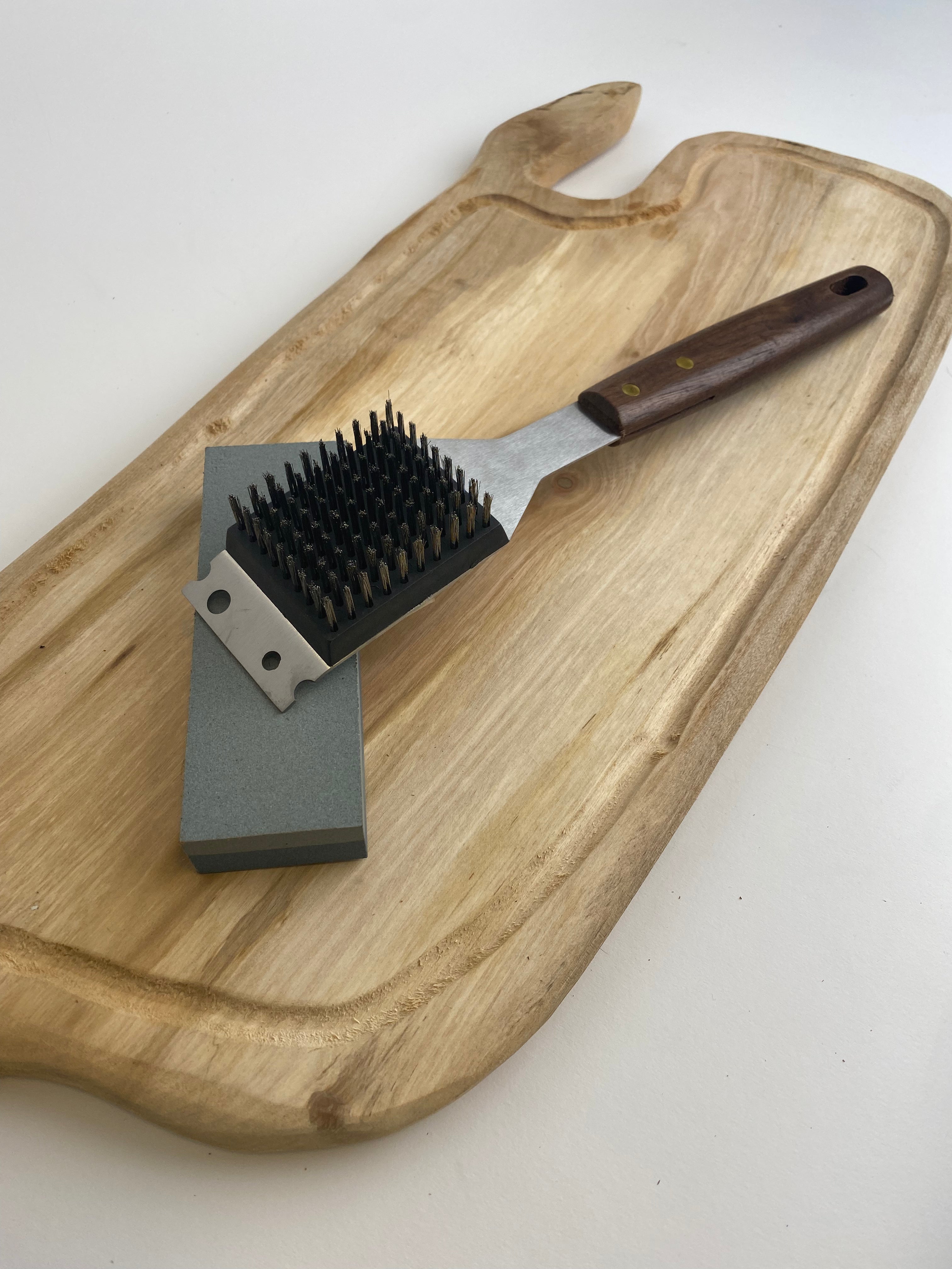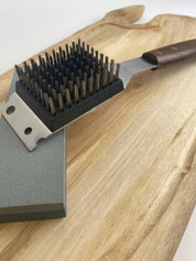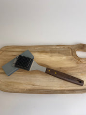 Cepillo parrillero de alta calidad dado que posee filamentos de acero inoxidable de alta resistencia, para una limpieza profunda en todo tipo de parrilla, y además en su punta cuenta con sistema de limpieza para grasa duras, marca Kangkawe.