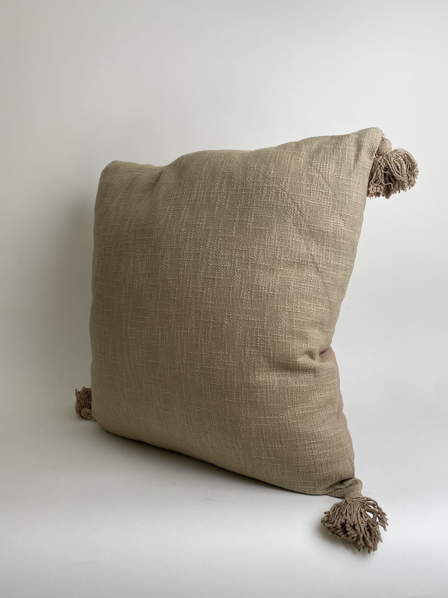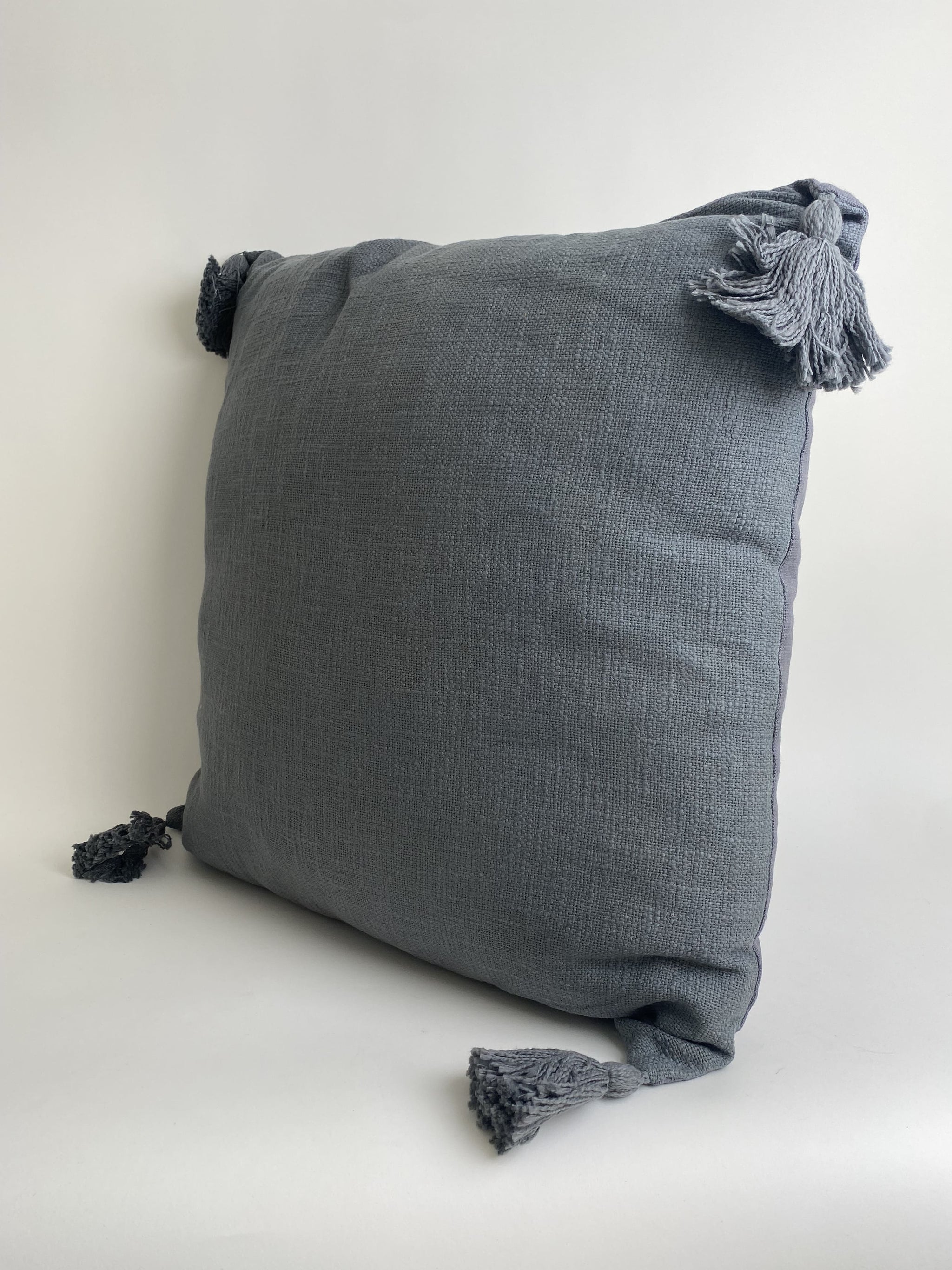 Cojín cuadrado de algodón, disponible en seis colores para que complementes tu decoración en cada espacio. De un sutil tamaño de 60x60 y con terminaciones de flecos en sus cuatro vértices.