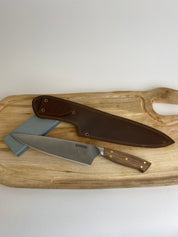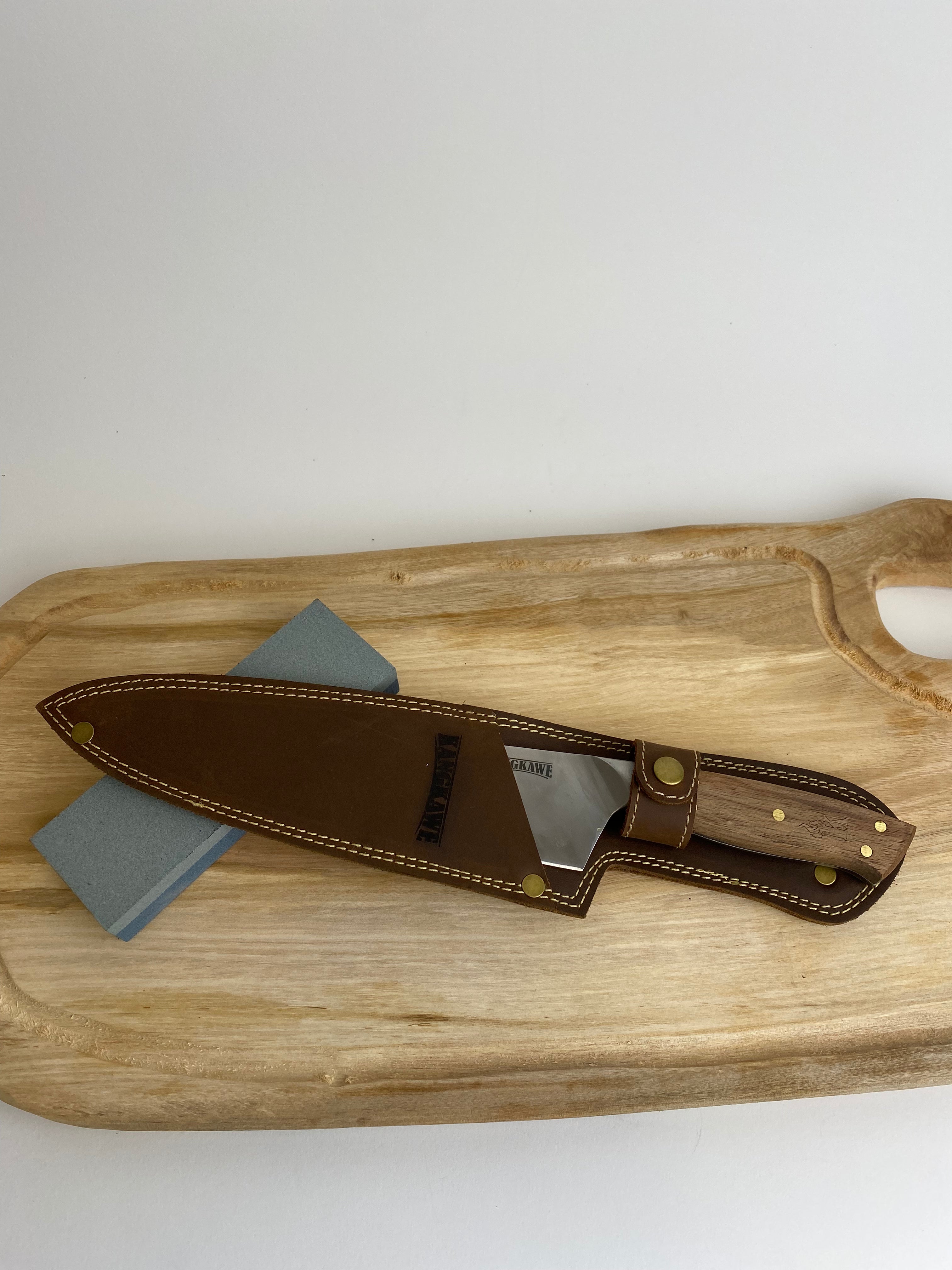 Cuchillo recto y liso que hace que la experiencia en cada corte sea única y diferente. Hoja de acero inoxidable de carbono, mango de madera nativa de nogal cepillado en una funda café de cuero para enganchar en tu cinturón o delantal, marca Kangkawe.