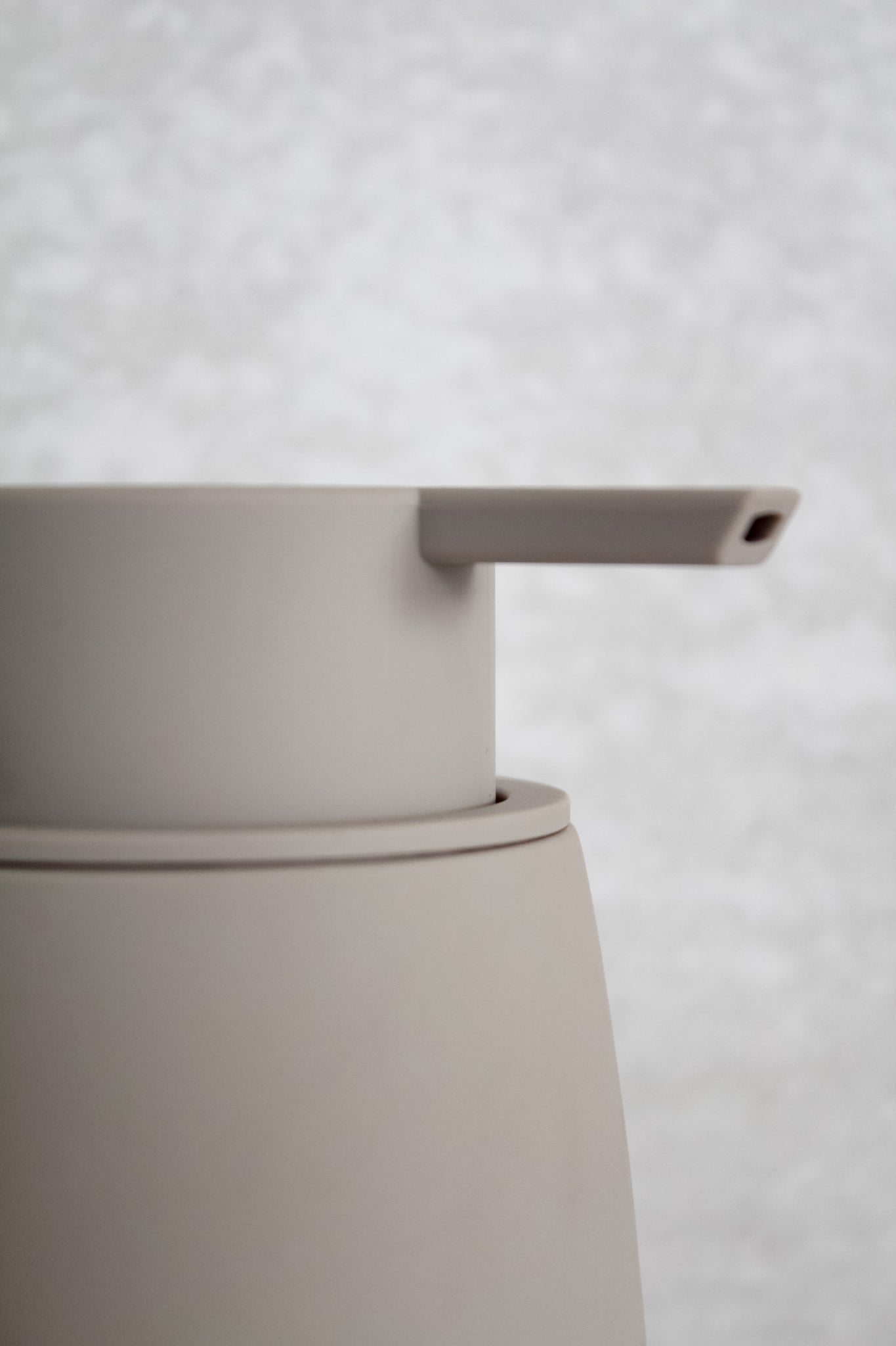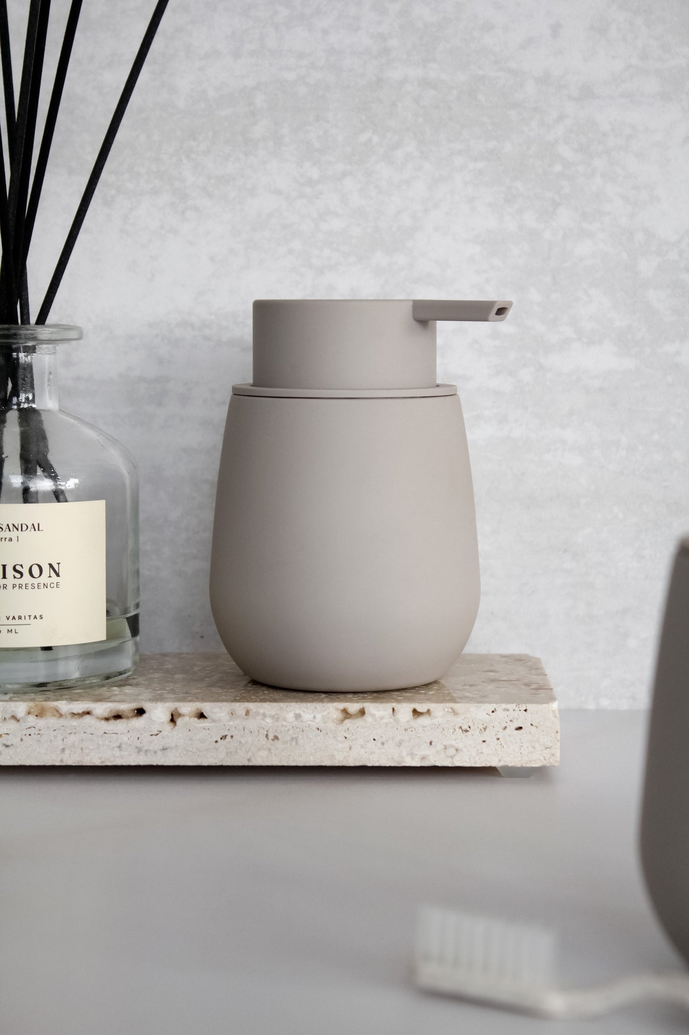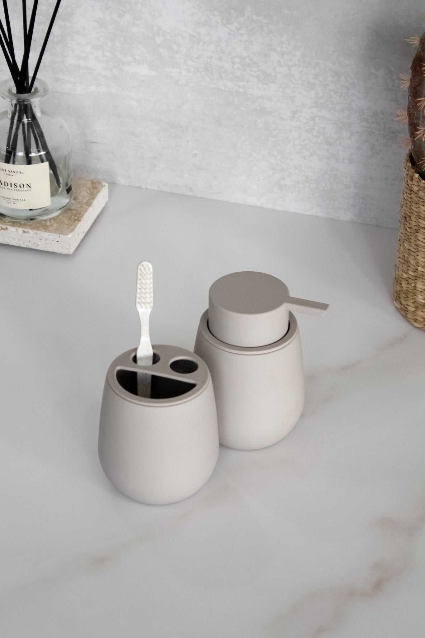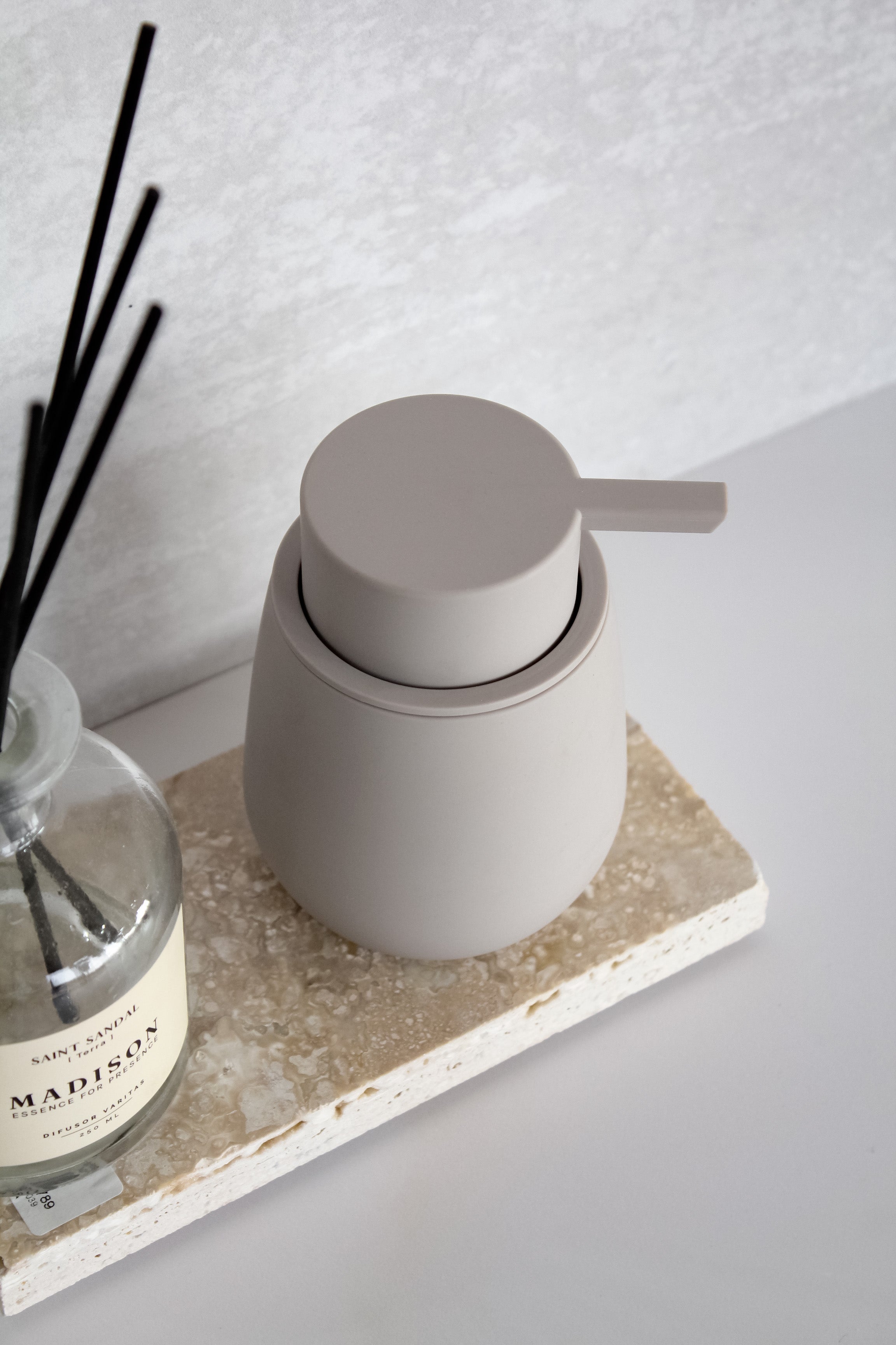 Dispensador plástico de color crema. Un modelo simple y sobrio en su forma y color, que puedes montarlo sobre una bandeja junto a un difusor de varitas, un florero de distinta altura o con el vaso del mismo juego para lucir la línea completa.