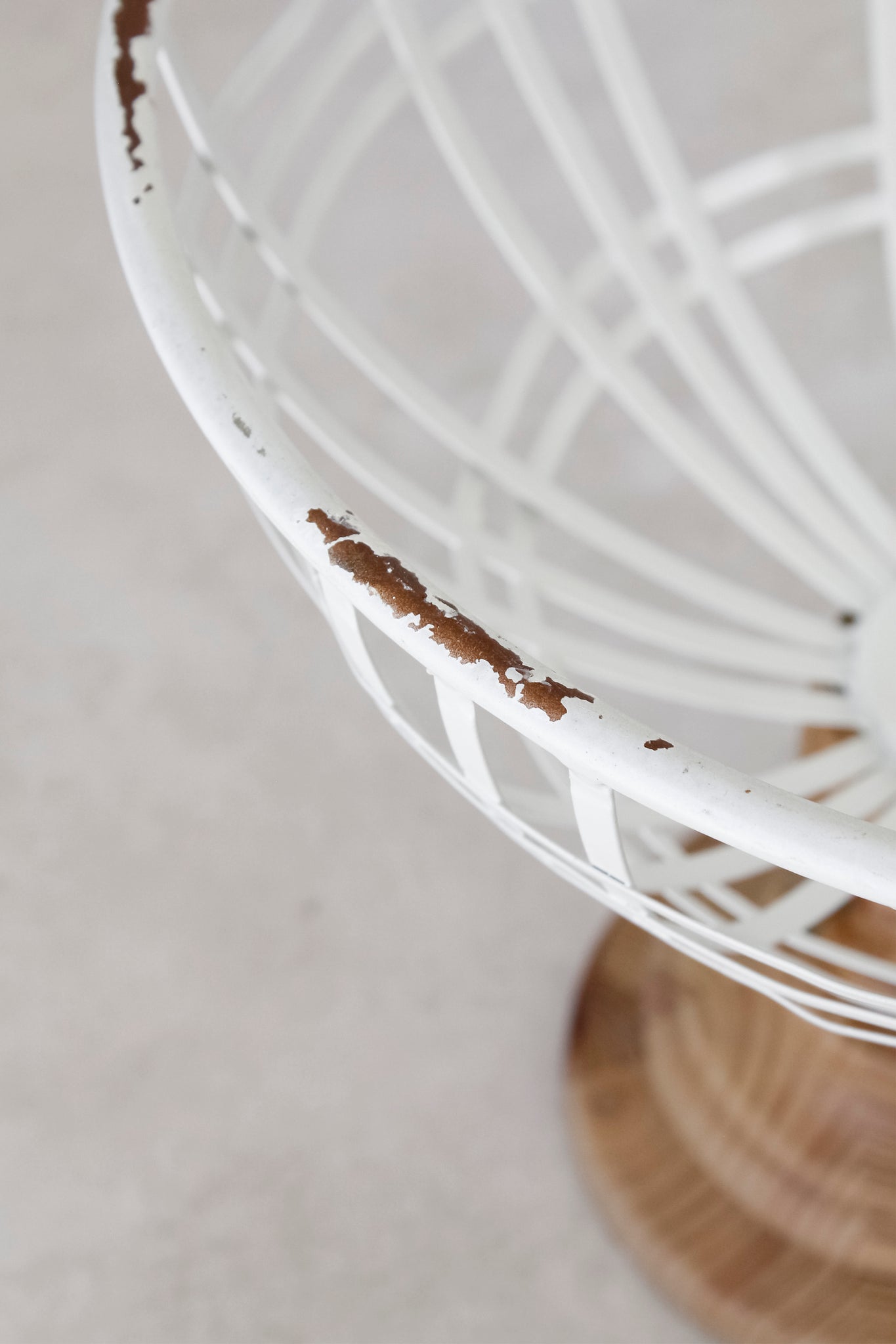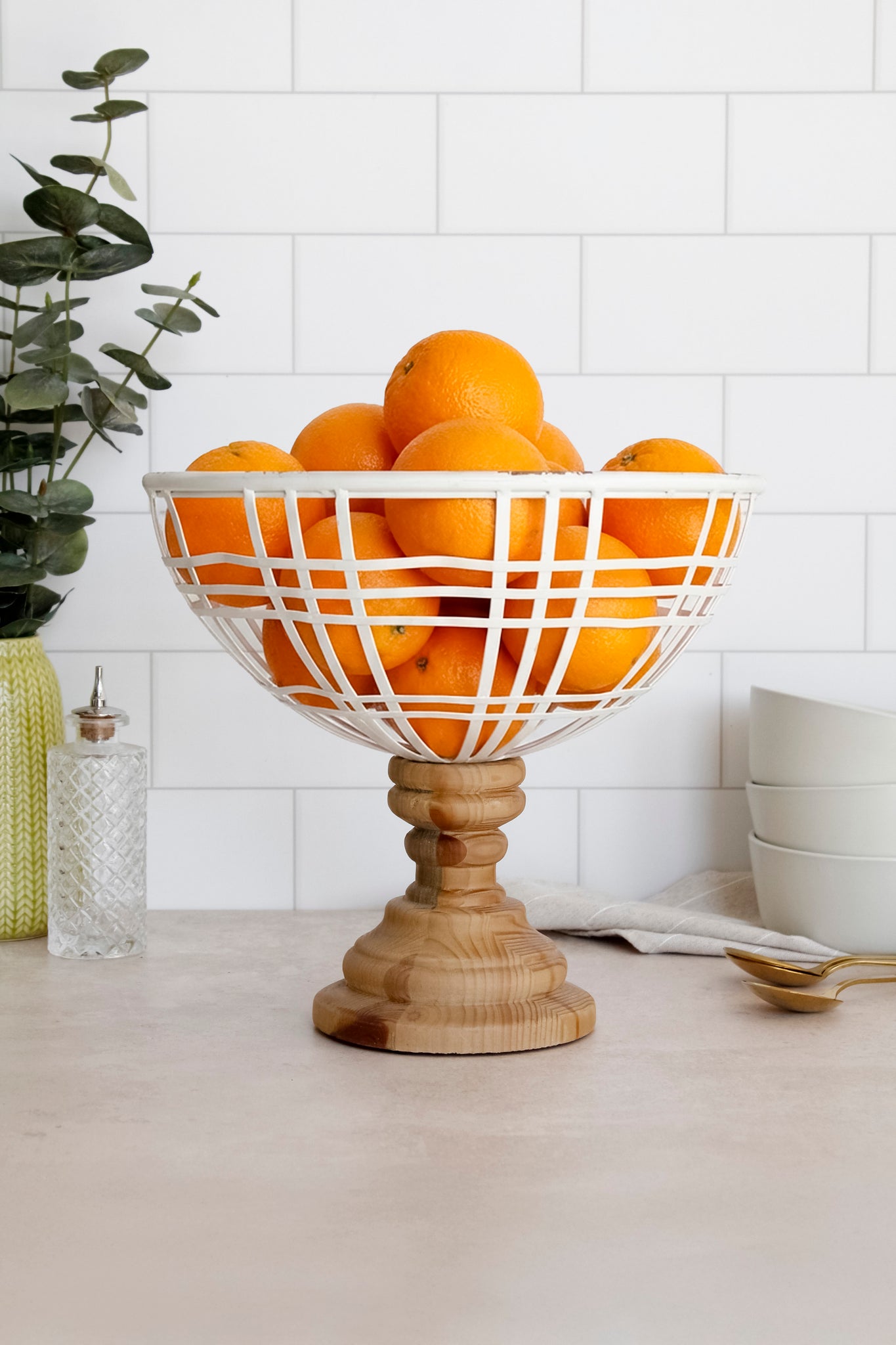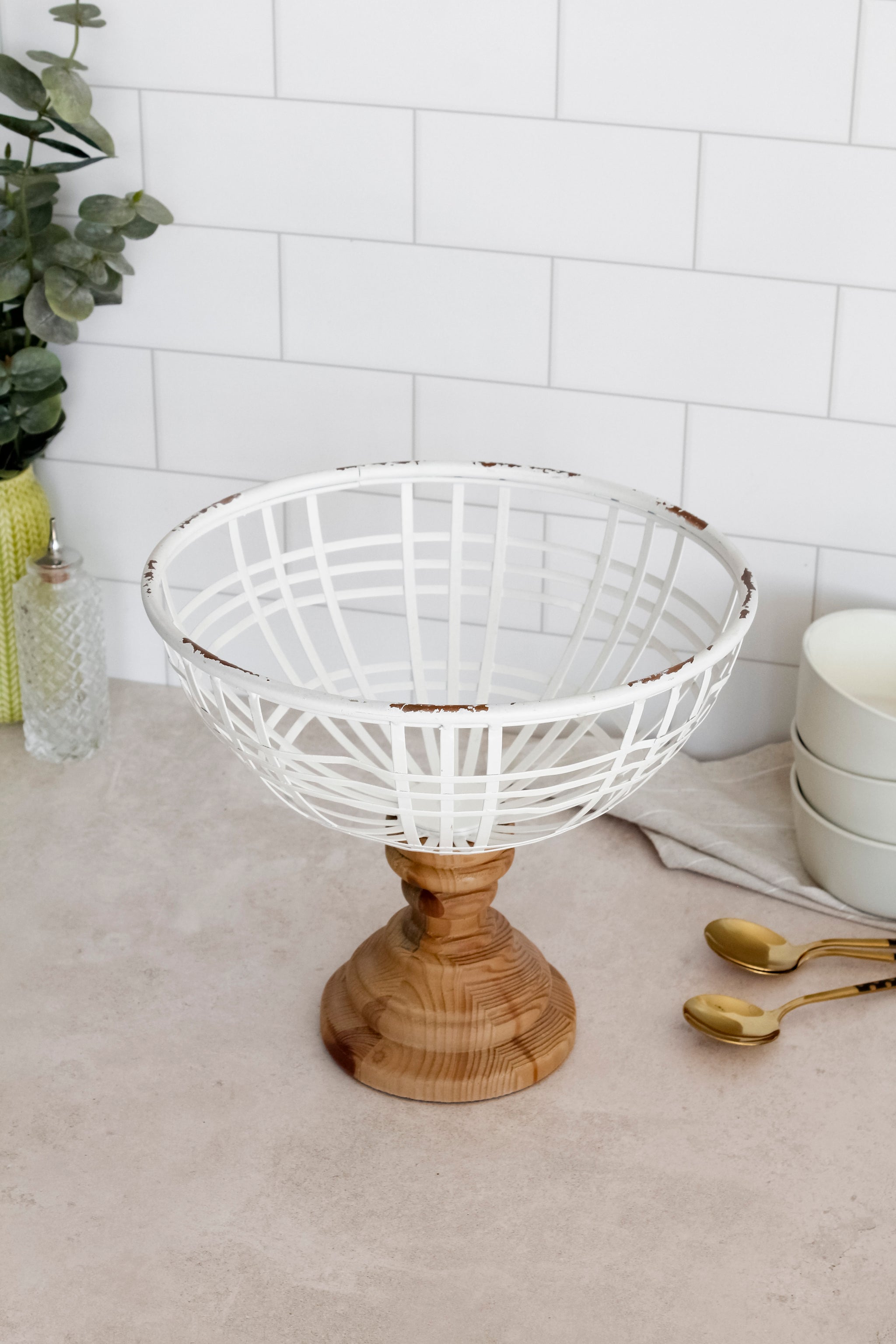Precioso frutero de rejilla de fierro blanco con base de madera. Un modelo sencillo y que destaca por la liviandad visual, que a la vez permite lucir la fruta como decoración en tu mesa de centro o cocina.