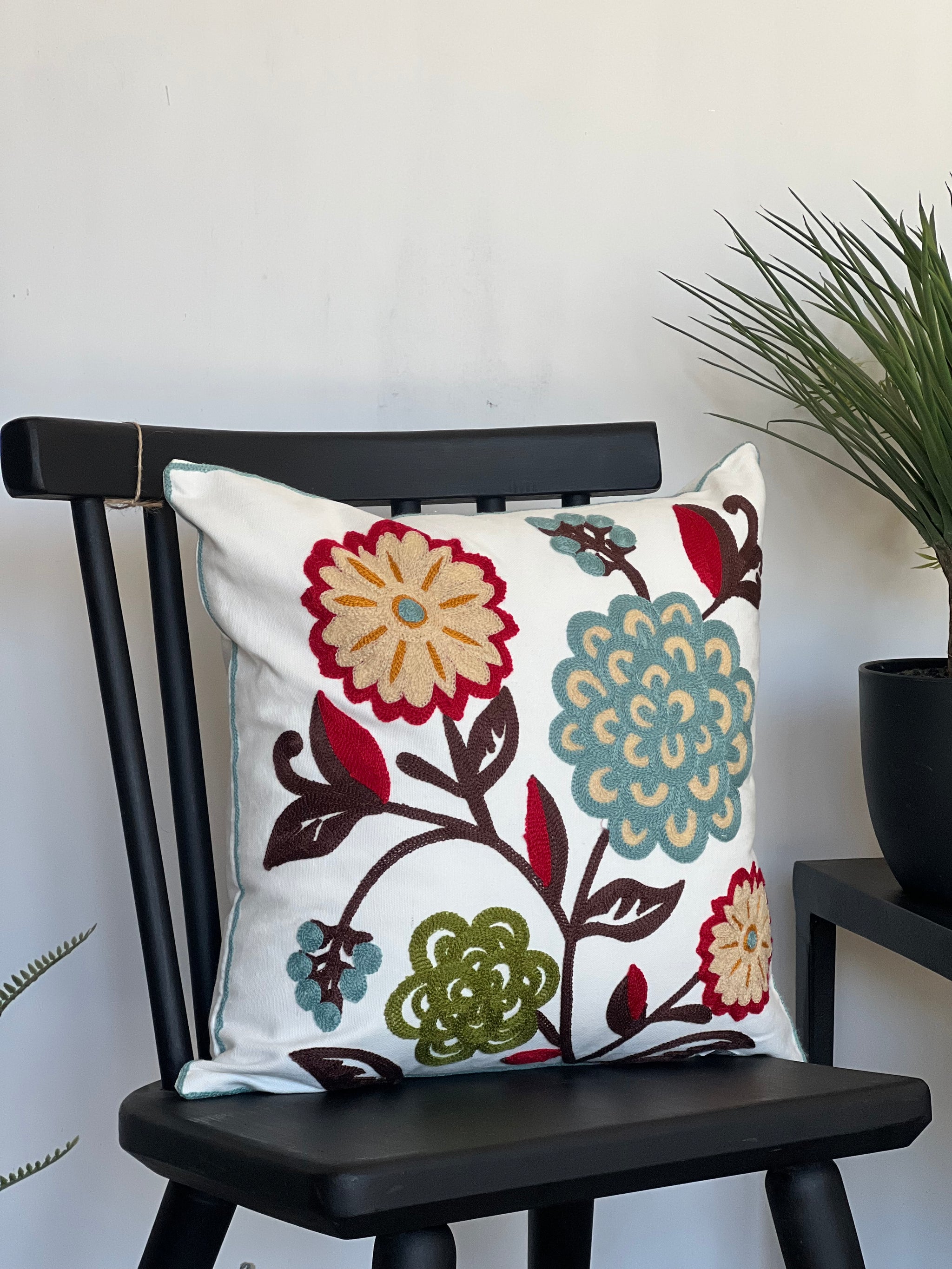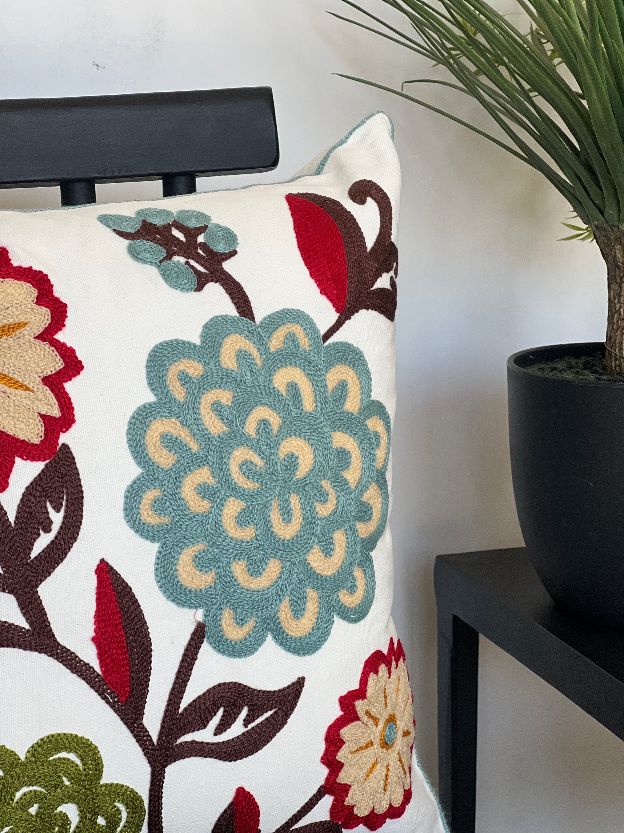 Diseñado en algodón con bordado de flores en tonos turquesa y burdeo principalmente. La combinación perfecta para que complemente con otros cojines en tu living, dormitorio o salita de estar.