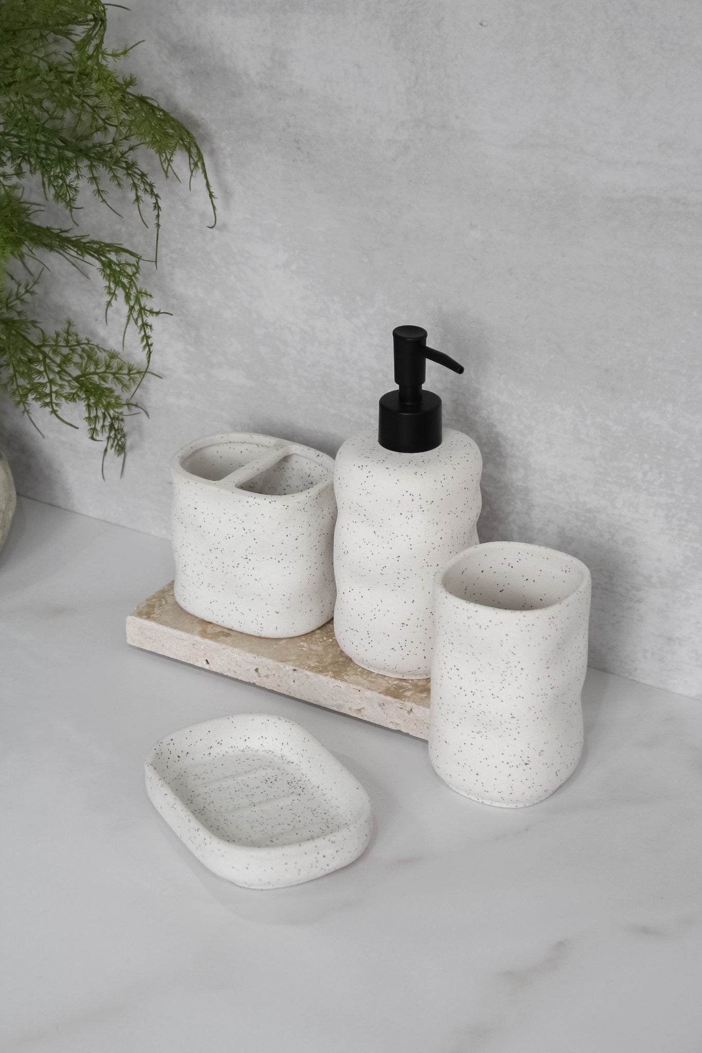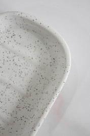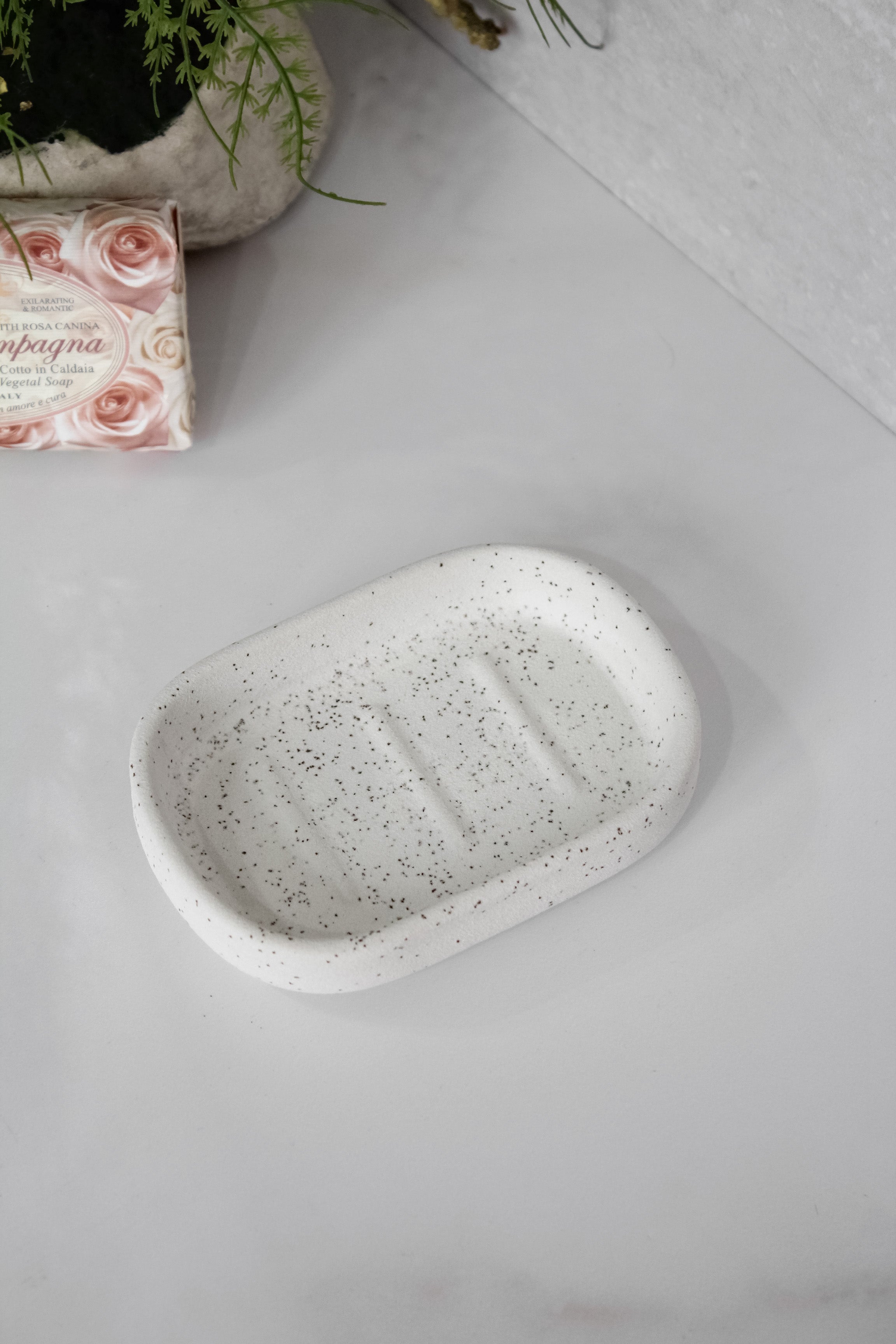 Jabonera de cerámica blanca jaspeada con detalles negros. Un modelo sobrio y estético que funciona perfecto para todo estilo de baño, y coronar la decoración de tu espacio. Te recomendamos montarlo con un bonito jabón en barra para darle un toque decorativo además de funcional.