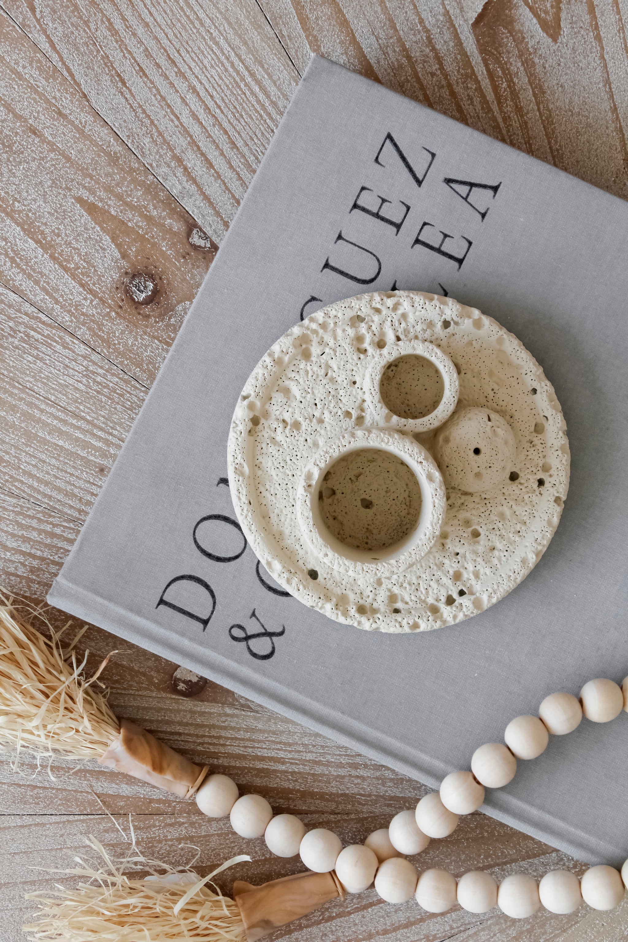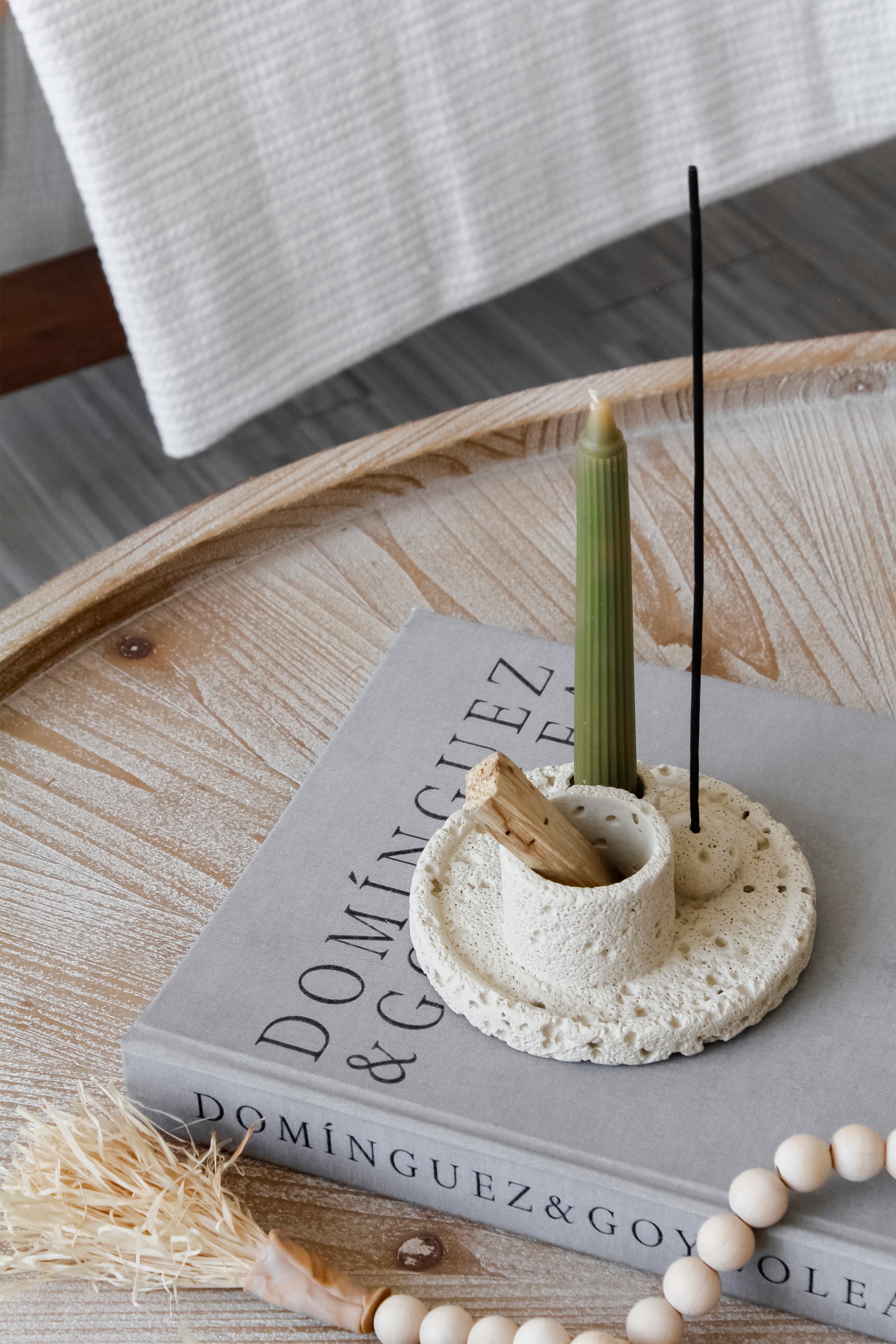 Portavela, porta incienso y porta palo santo, todo en uno. Hecho en cerámica porosa, además de ser precioso para decorar ese rincón, es la combinación perfecta para mantener tu espacio cálido, con buen aroma y buenas energías.
