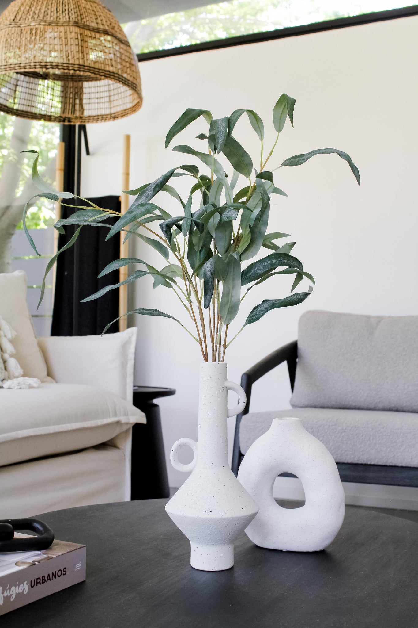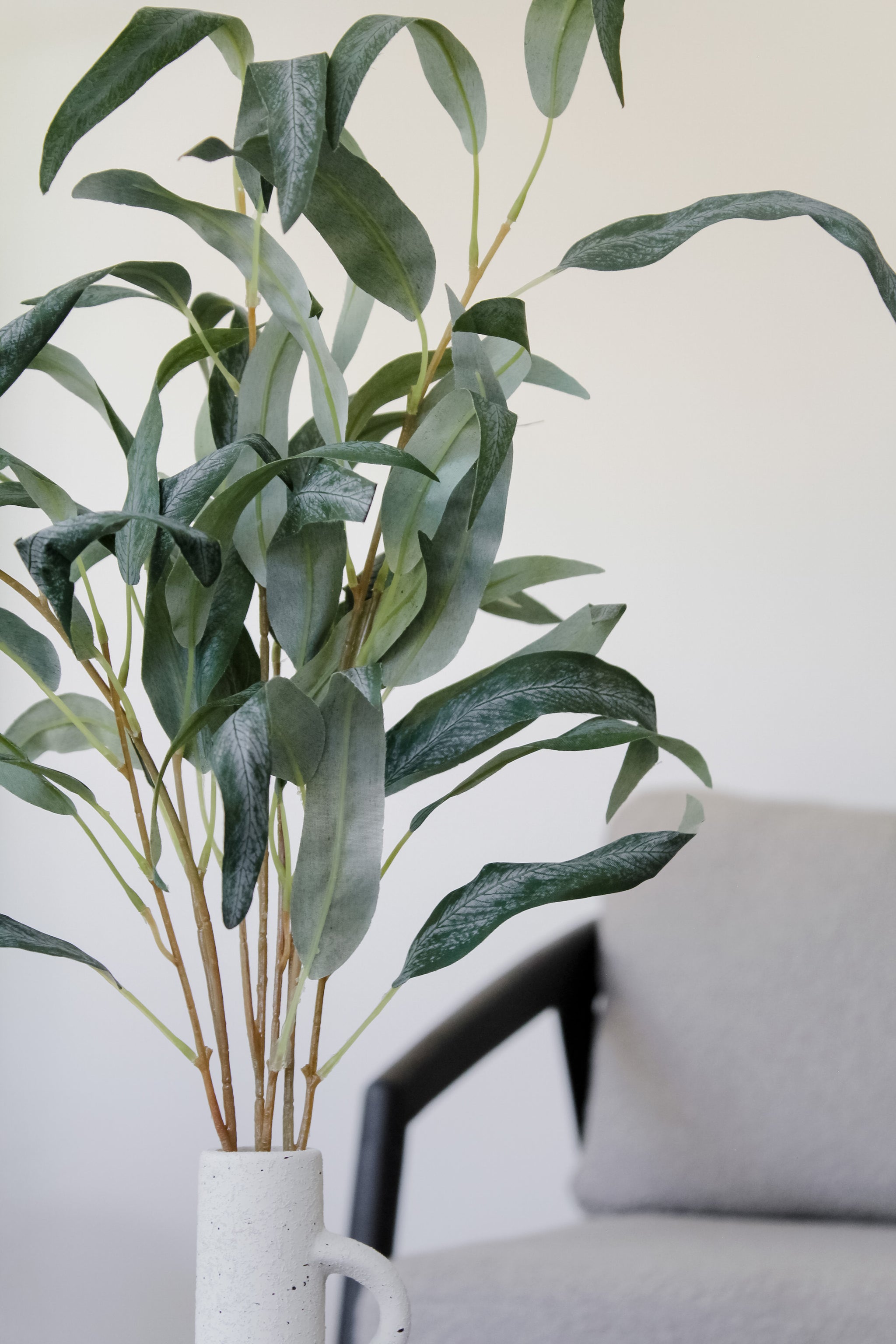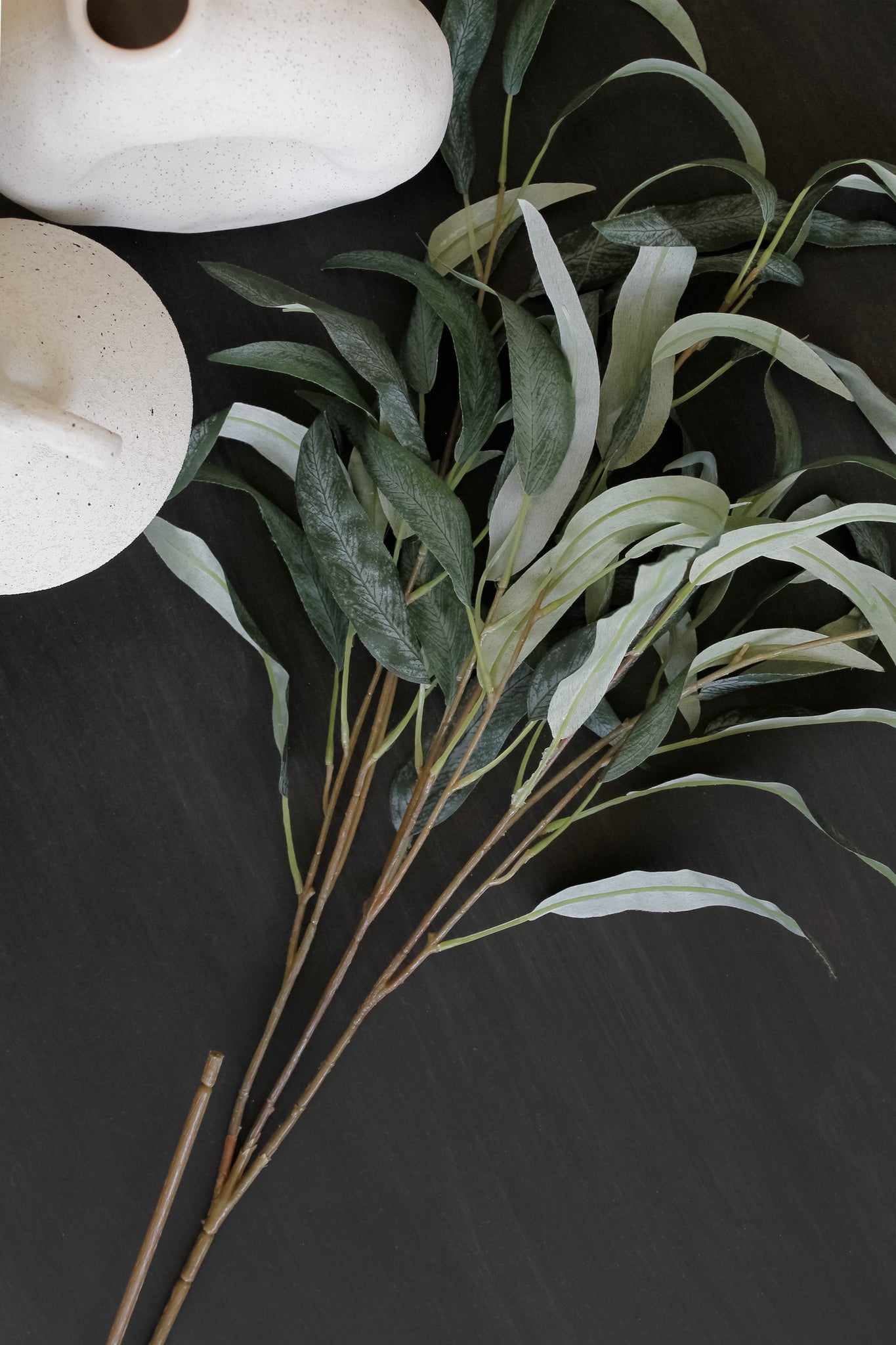 Imitación de vara de eucalipto de hoja larga. Un modelo de cuerpo suelto que entrega movimiento y ese toque natural que buscas en tu espacio, perfecto para decorar floreros y jarrones.