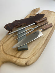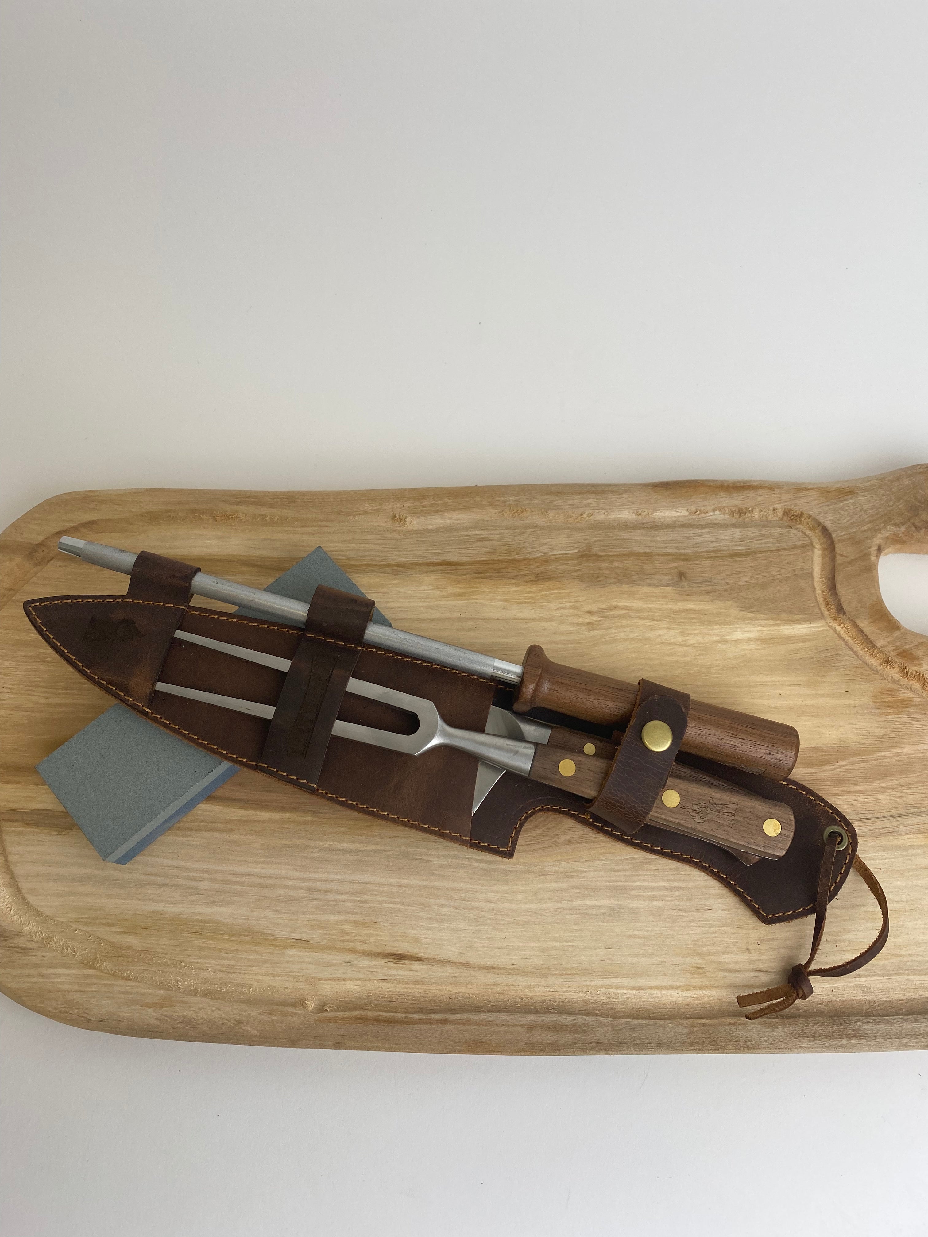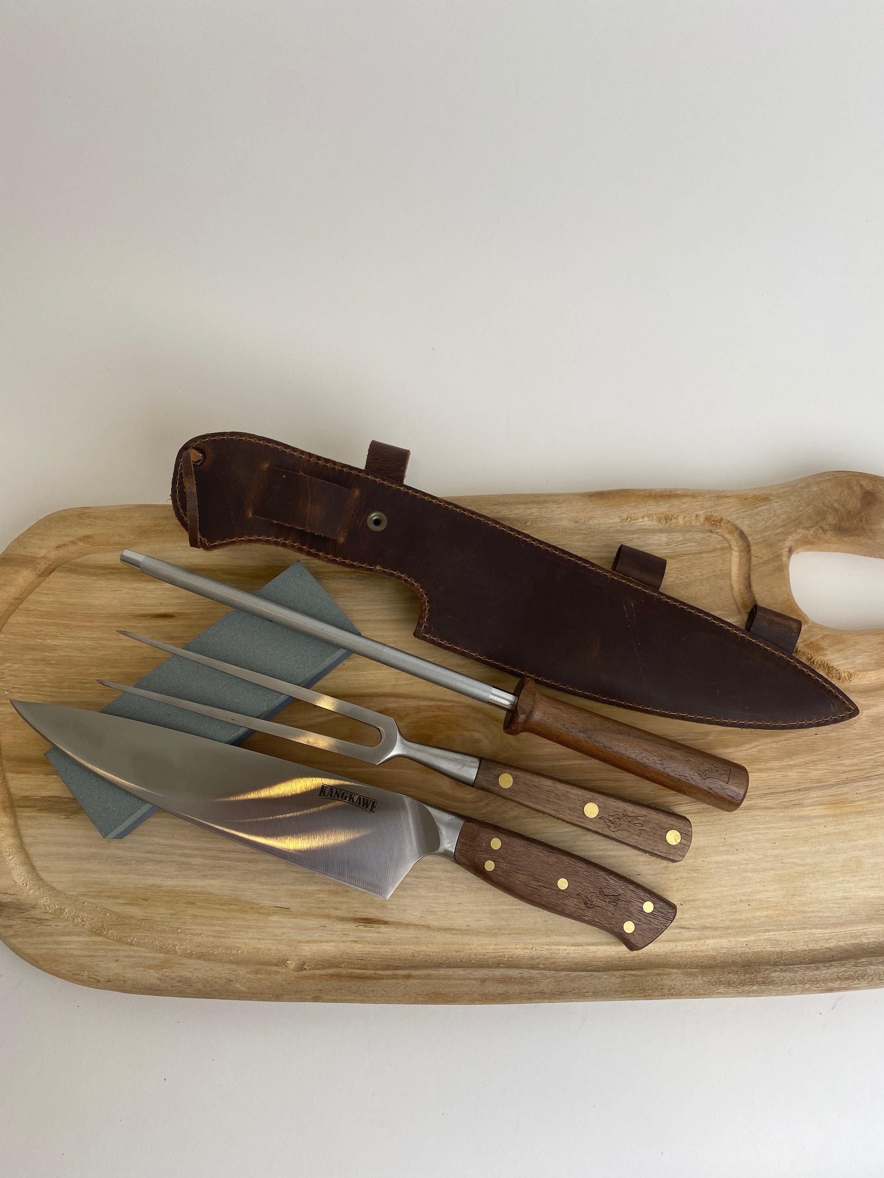 Juntamos todo en un sólo pack para un profesional del asado, estos tres productos reúnen todo lo necesario para un buen trabajo. Incluye cuchillo Catemu de acero inoxidable, pincho y chaira, en una funda café de cuero para enganchar en tu cinturón o delantal, marca Kangkawe.